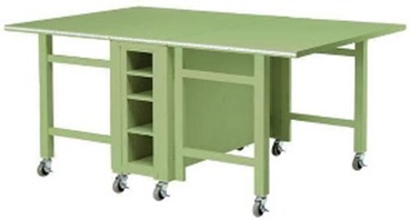 Стол раскладной, легко передвинуть в требуемое место - основание на колесах. В столе имеются полки для принадлежностей.Габаритные размеры: