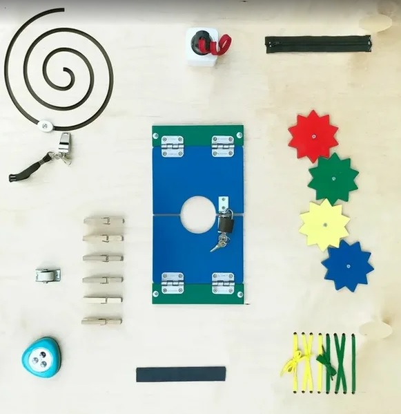 Данный бизиборд развивает практические навыки и умения. На небольшой доске размещено множество элементов из обычной, «взрослой» жизни. Если в быту малышу не разрешают трогать розетку, то в игре с бизибордом ее можно не только трогать, но и вынимать вилку, втыкать ее обратно.На игровом поле предусмотрены: